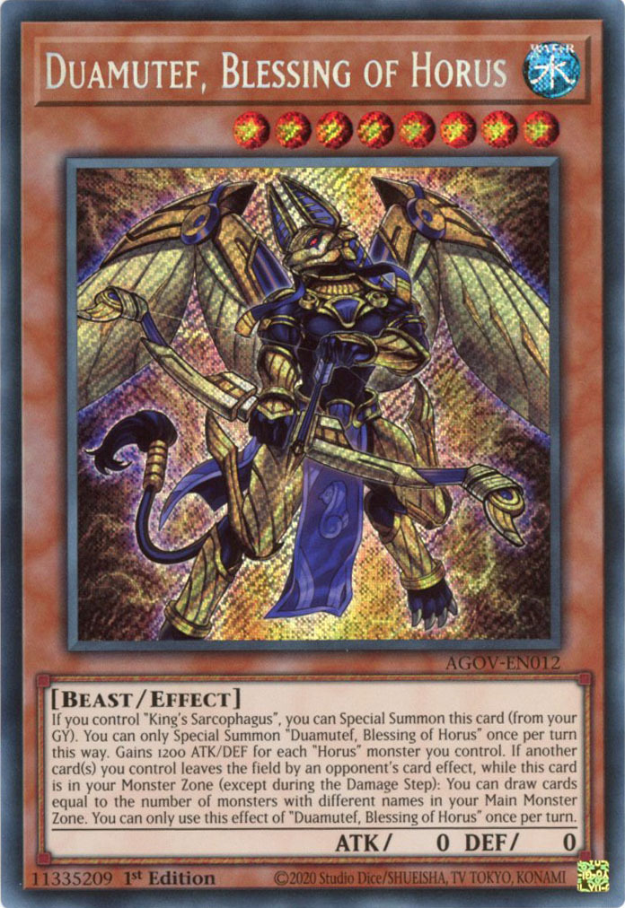- AGOV-EN012 Duamutef, Blessing of Horus :: Secret Rare 1st Edition YuGiOh Card