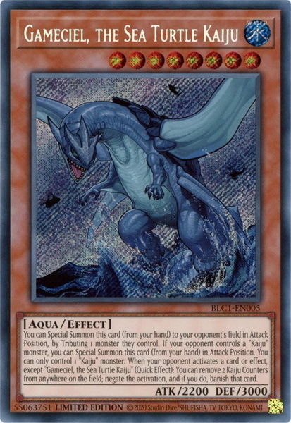 - BLC1-EN005 Gameciel, the Sea Turtle Kaiju : Secret Rare Limited Edition YuGiOh Card