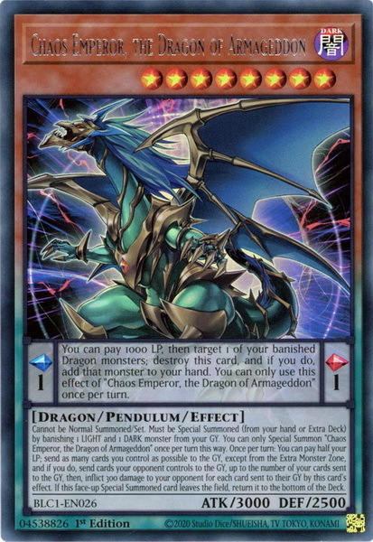 - BLC1-EN026 Chaos Emperor, the Dragon of Armageddon : Silver Ultra Rare 1st Edition YuGiOh Card