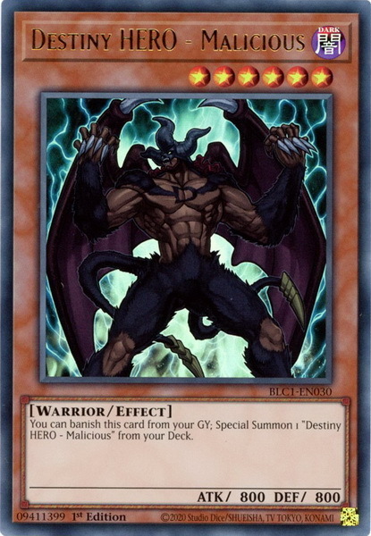 - BLC1-EN030 Destiny HERO - Malicious : Gold Ultra Rare 1st Edition YuGiOh Card