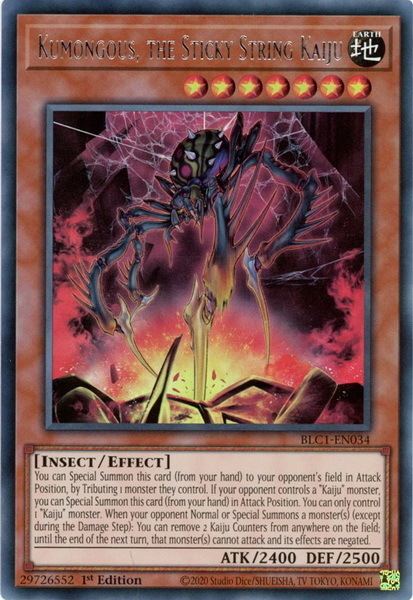 - BLC1-EN034 Kumongous, the Sticky String Kaiju : Silver Ultra Rare 1st Edition YuGiOh Card
