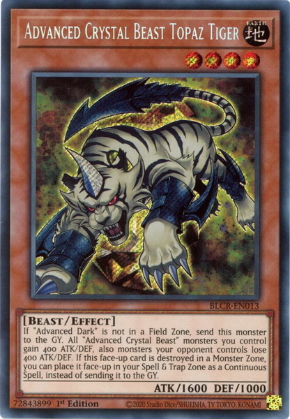 - BLCR-EN013 Advanced Crystal Beast Topaz Tiger :: Secret Rare 1st Edition Mint YuGiOh Card