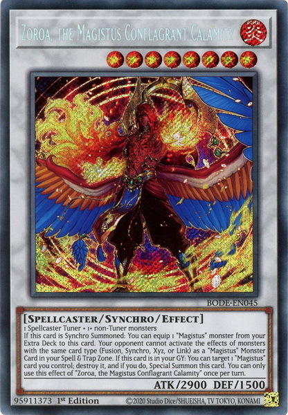 - BODE-EN045 Zoroa, the Magistus Conflagrant Calamity Secret Rare 1st Edition Mint YuGiOh Card