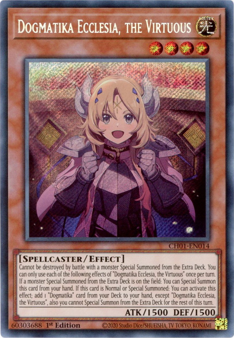 - CH01-EN014 Dogmatika Ecclesia, the Virtuous : Secret Rare 1st Edition Mint YuGiOh Card