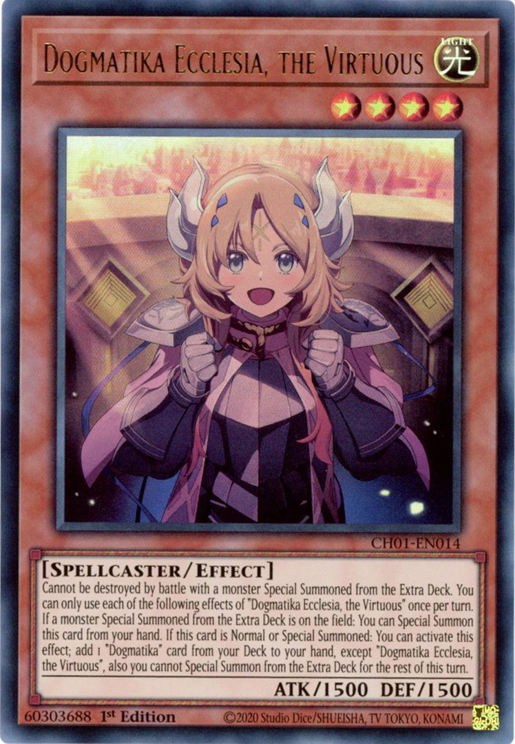 - CH01-EN014 Dogmatika Ecclesia, the Virtuous : Ultra Rare 1st Edition Mint YuGiOh Card