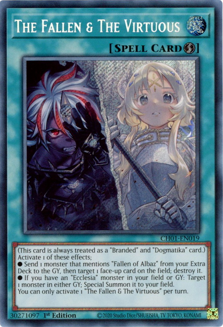 - CH01-EN019 The Fallen & The Virtuous : Secret Rare 1st Edition Mint YuGiOh Card