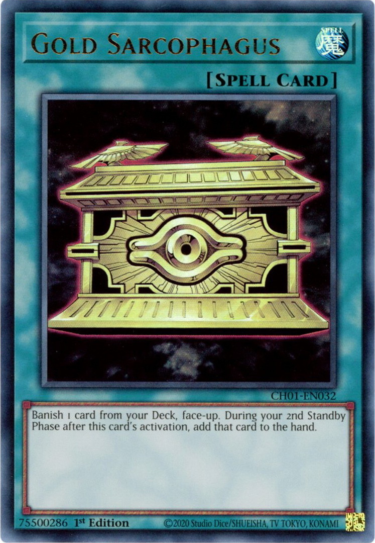 - CH01-EN032 Gold Sarcophagus : Ultra Rare 1st Edition Mint YuGiOh Card