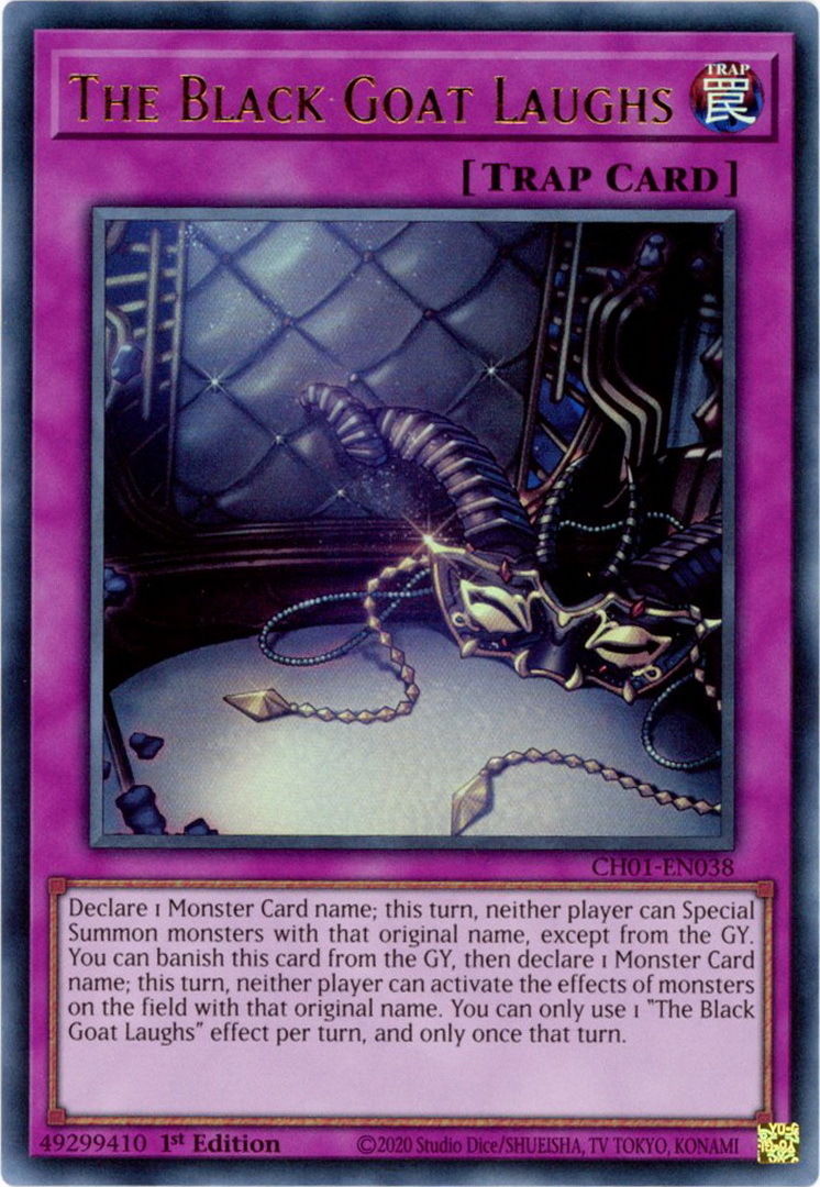 - CH01-EN038 The Black Goat Laughs : Ultra Rare 1st Edition Mint YuGiOh Card