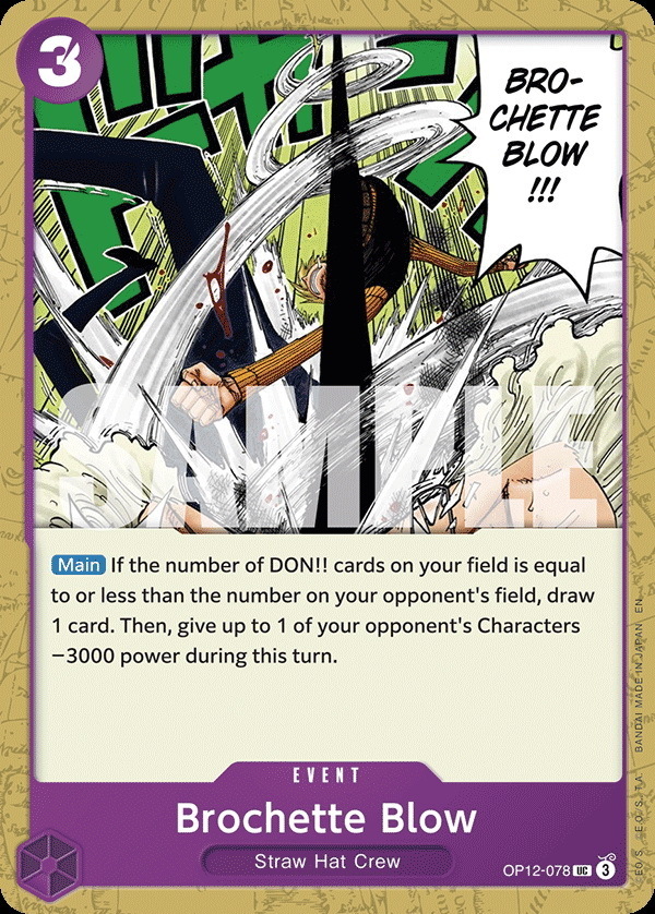 - Effect: [Main] If the number of DON!! cards on your field is equal to or less than the number on your opponent's field, draw 1 card. Then, give up to 1 of your opponent's Characters -3000 power during this turn.