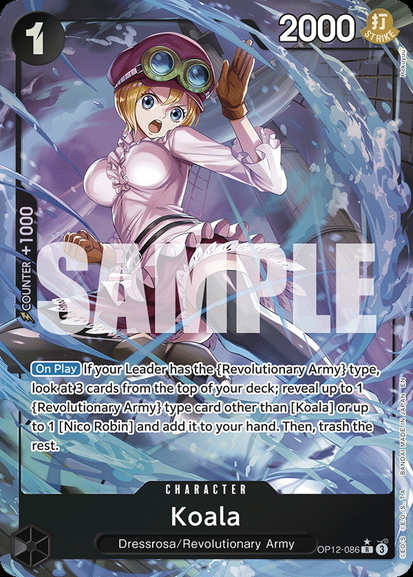 - Effect: [On Play] If your Leader has the {Revolutionary Army} type, look at 3 cards from the top of your deck; reveal up to 1 {Revolutionary Army} type card other than [Koala] or up to 1 [Nico Robin] and add it to your hand. Then, trash the rest.